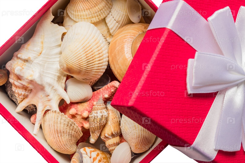 Розовая подарочная коробка с белым бантом, полным морских раковин, изолированных на белом фоне. тропический отдых по концепции зимнего сезона