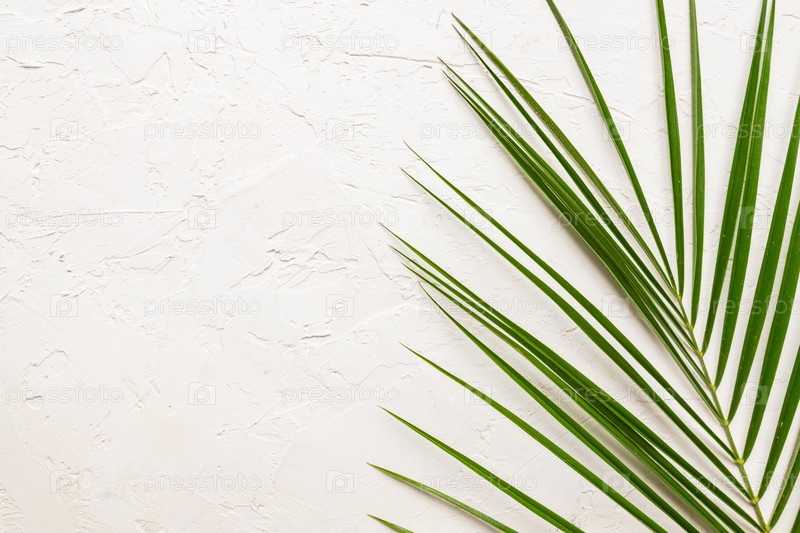Тропический зеленый пальмовый лист на белом бетонном фоне. Плоская планировка, вид сверху