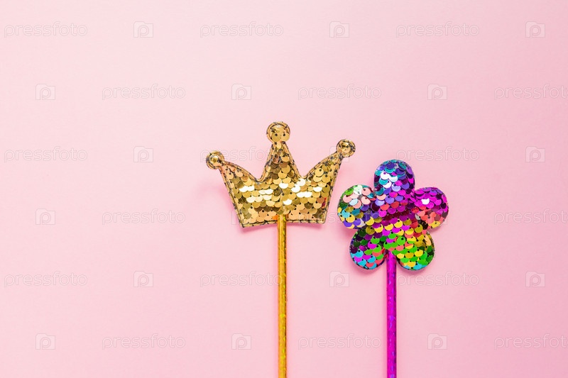 Золотая корона и розовый цветок из круглых блесток на розовом фоне. Модные аксессуары для вечеринок с копией пространства. Праздничная плоская планировка. Минимальный стиль