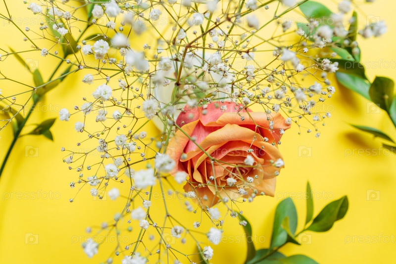 Цветочная композиция. Розовая роза, белая гипсофила и веточки иглицы на желтом фоне. Открытка на день рождения или женский день