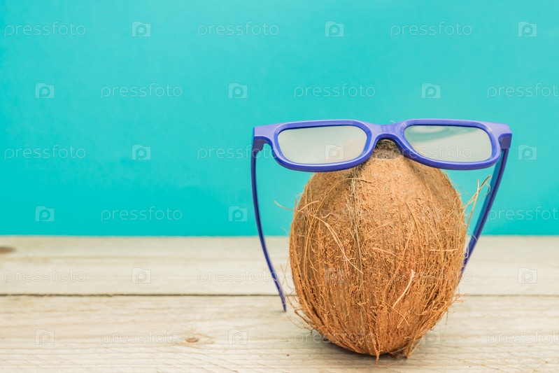 Кокосовые очки в 3D-очках на синем фоне.Концепция лета и путешествий