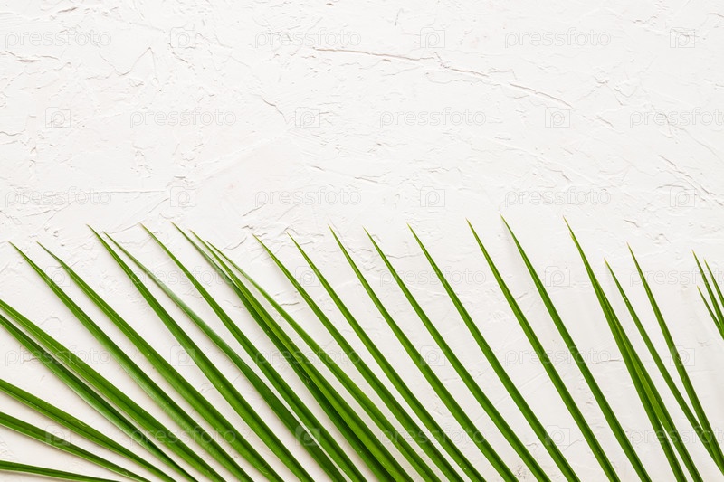 Тропический зеленый пальмовый лист на белом бетонном фоне. Плоская планировка, вид сверху