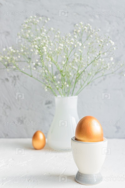 Крупный план золотого яйца в яичной чашке на фоне букета гипсофилы. Уютный пасхальный натюрморт
