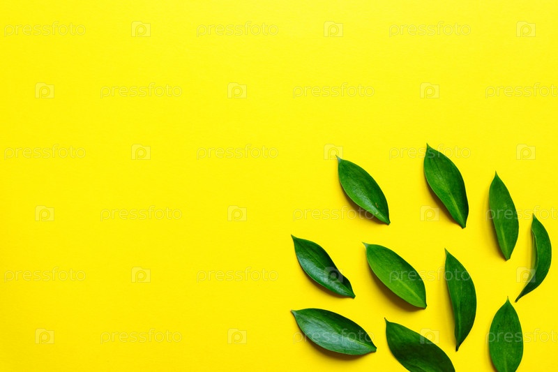 Композиция из листьев рускуса. Плоская планировка, вид сверху. Летний творческий минимальный фон с тропическими листьями. Шаблон листьев