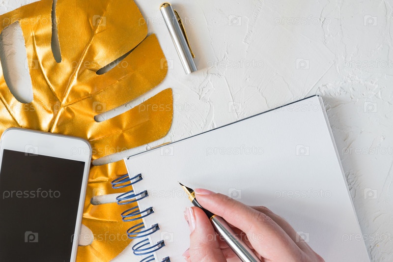 Вид сверху женского рабочего стола. Золотой тропический лист монстера, пустой блокнот, белый смартфон и ручка на белом бетонном фоне. Стильная минимальная планировка