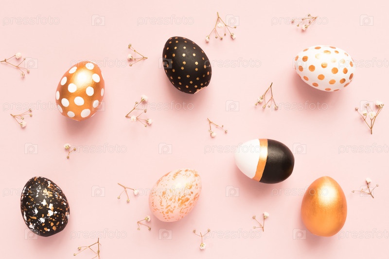 Верхний вид деревянных крашеных яиц в золотых, черных и розовых тонах с веткой гипсофилы на розовом фоне
