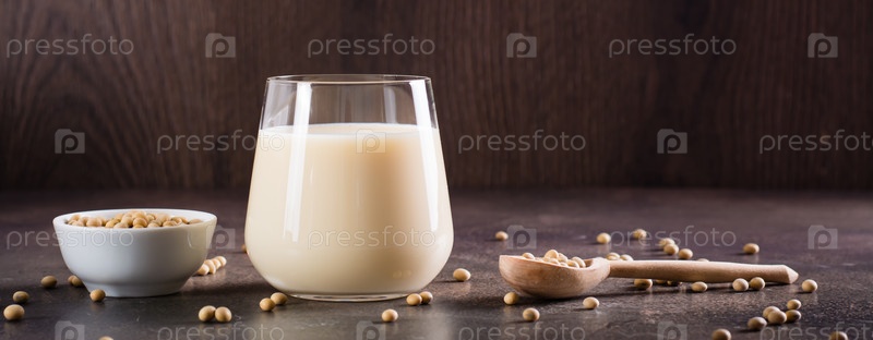 Соевое молоко в стакане и соевые бобы в миске на столе. Безлактозный напиток. Веб-баннер