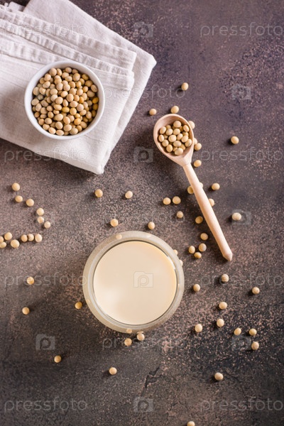 Стакан соевого молока и соевых бобов на столе. Растительный белок. Верхний и вертикальный вид