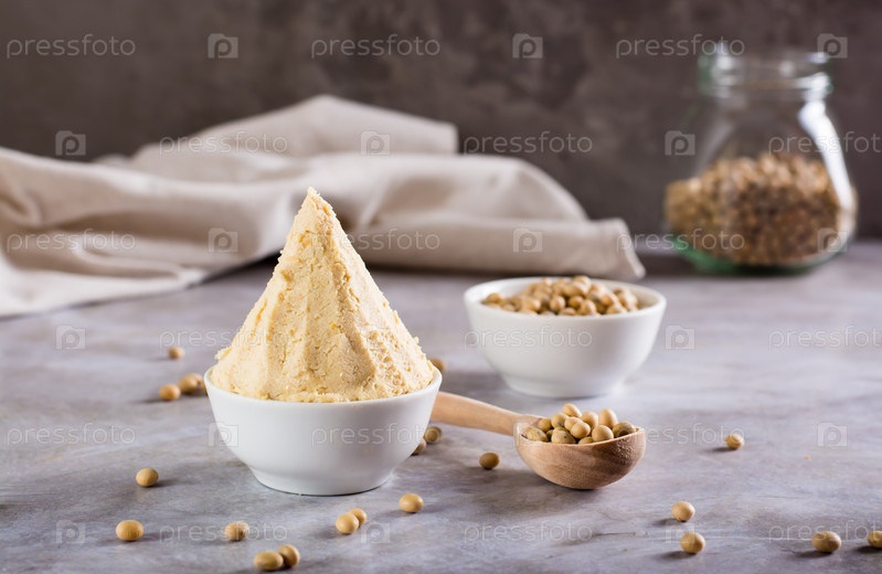 Японская приправа мисо, ферментированная из сои и риса кодзи в миске на столе