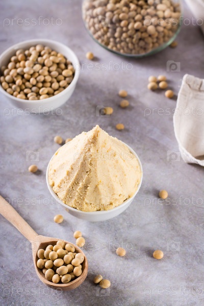 Традиционная ферментированная соевая приправа мисо в миске на столе. Японская еда. Вертикальный вид