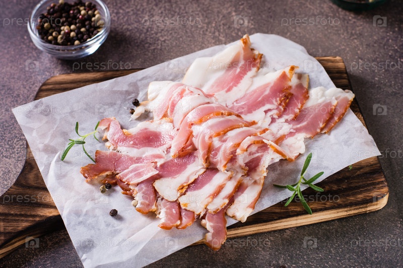 Сырые ломтики бекона на бумаге на разделочной доске на столе. Сытный перекус
