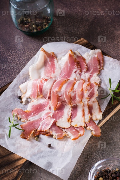 Сырые ломтики бекона на бумаге на разделочной доске на столе. Сытный перекус. Вертикальный вид