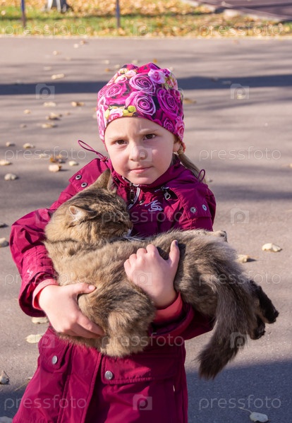 Осенью на улице девушка держит в руках красивого бездомного кота