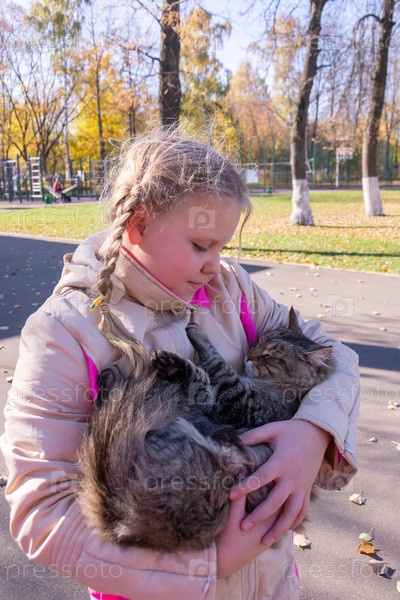 Осенью на улице девушка держит в руках красивого бездомного кота
