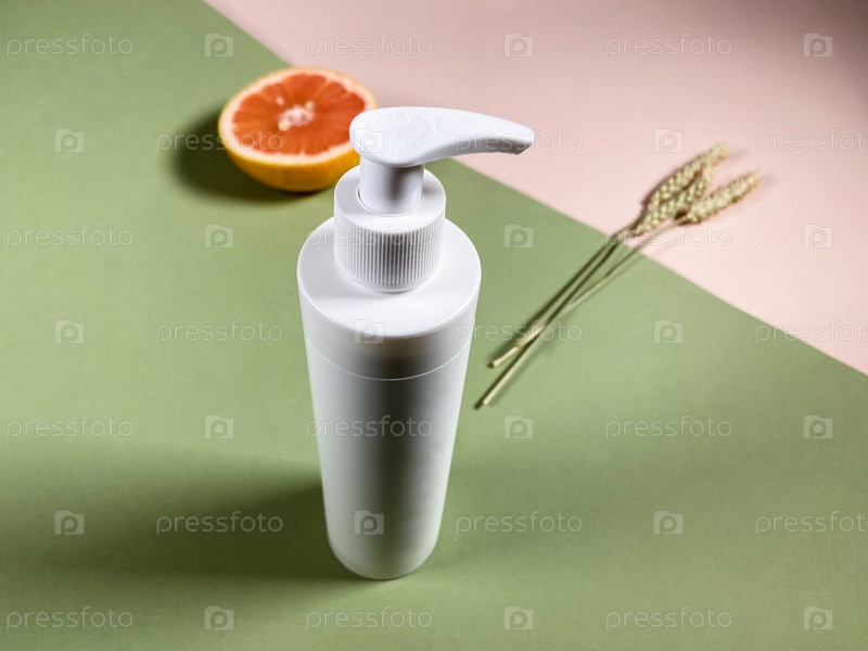 Белая пластиковая бутылка, половинка свежего грейпфрута