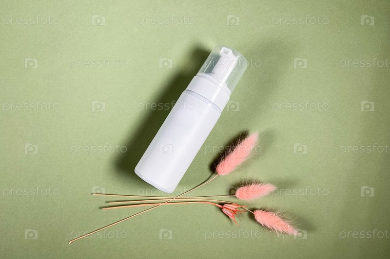 Вид сверху на пластиковую бутылку с белой помпой на цвете хаки