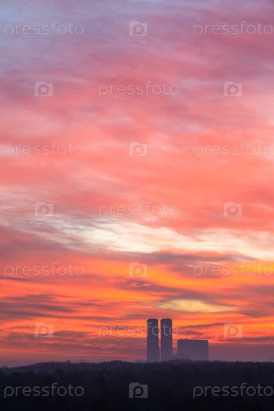 Красные облака в небе рассвета над городским парком и башнями
