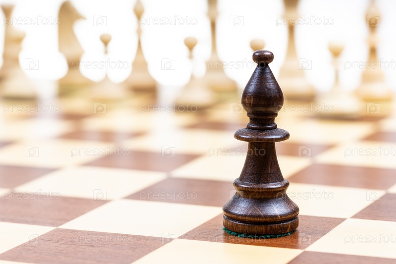 Черный слон против белых шахматных фигур на доске