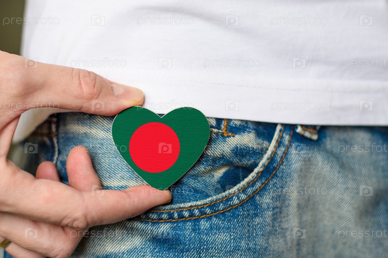 Деревянный значок с флагом Бангладеш в форме сердца в мужской руке