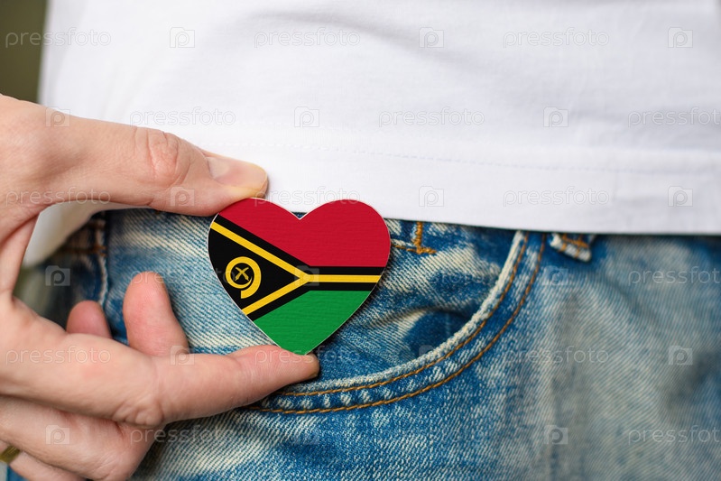 Деревянный значок с флагом Вануату в форме сердца в мужской руке