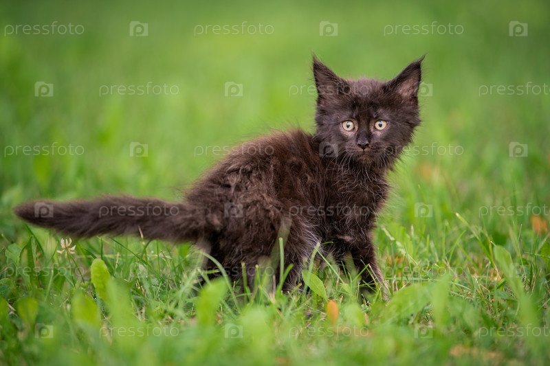 Маленький игривый черный котенок Мейн Кун гуляет по зеленой траве