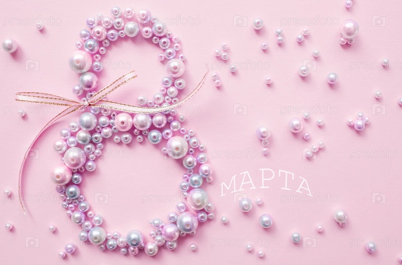 Международный женский день. Баннер, флаер, красивая открытка на 8 марта. Жемчуг в форме цифры восемь на розовом фоне