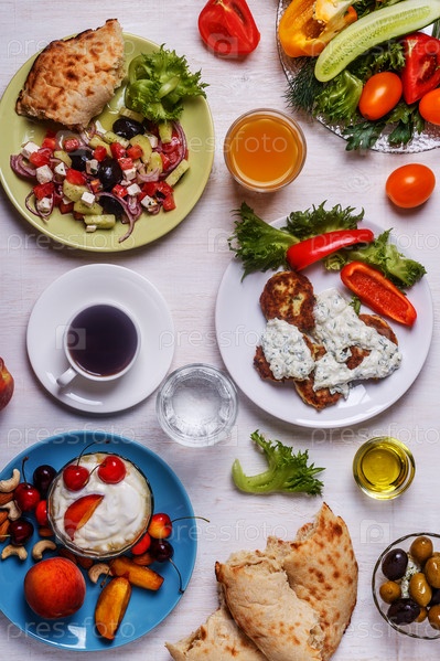 Греческие закуски - оладьи из кабачков, греческий салат, йогурт