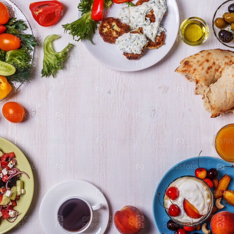 Греческие закуски - оладьи из кабачков, греческий салат, йогурт