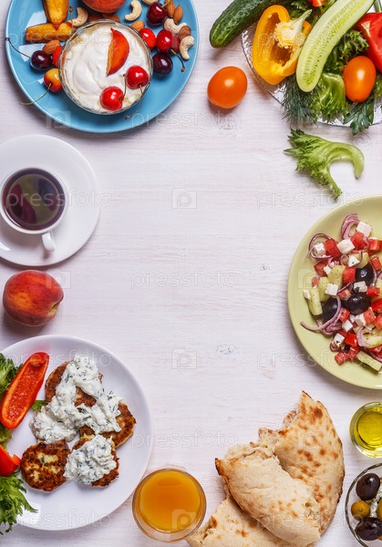 Греческие закуски - оладьи из кабачков, греческий салат, йогурт