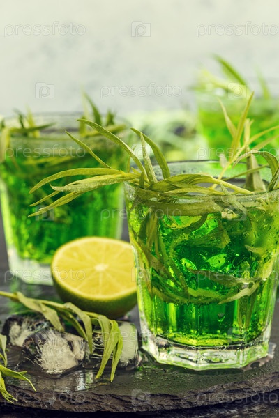 Зеленый коктейль с лаймом, содовой, колотым льдом и листьями эстрагона