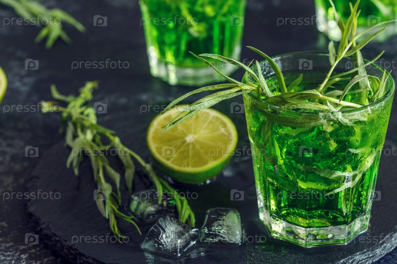 Зеленый коктейль с лаймом, содовой, колотым льдом и листьями эстрагона
