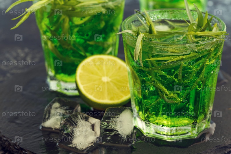 Зеленый коктейль с лаймом, содовой, колотым льдом и листьями эстрагона
