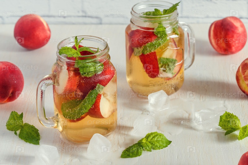 Домашний лимонад с персиками и листьями мяты