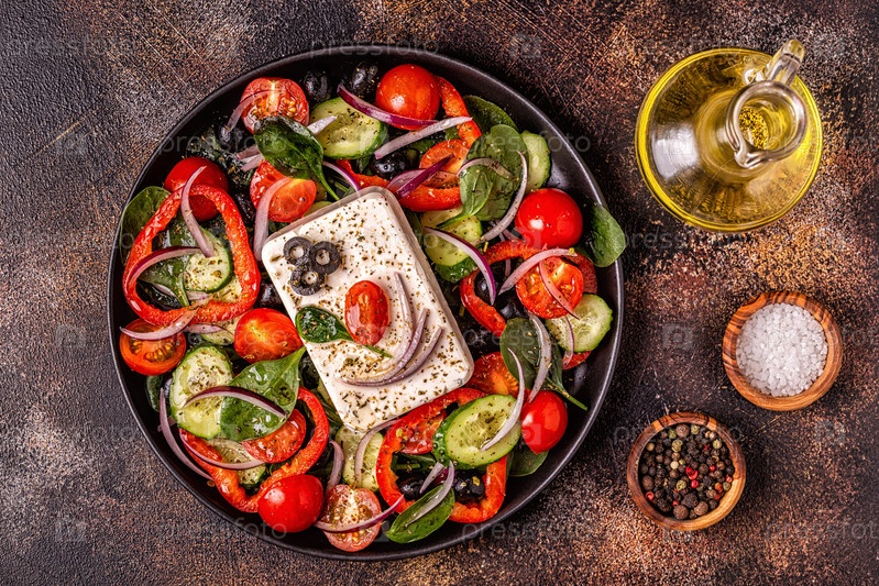 Греческий салат из свежих огурцов, помидоров, сладкого перца, шпината, красного лука, сыра фета и оливок