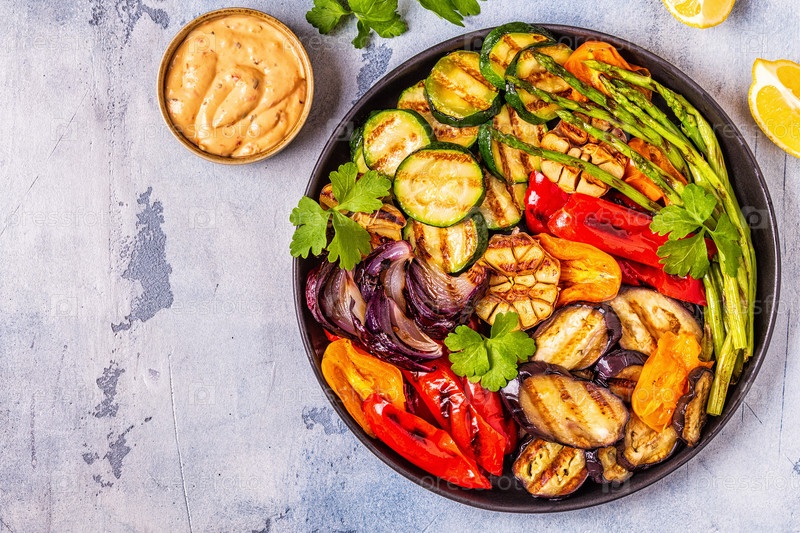 Жареные овощи на тарелке с соусом