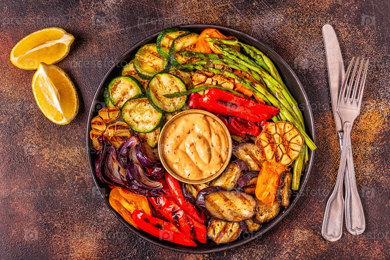 Жареные овощи на тарелке с соусом