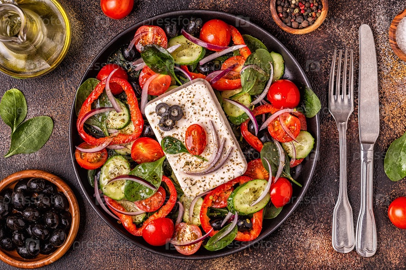 Греческий салат из свежих огурцов, помидоров, сладкого перца, шпината, красного лука, сыра фета и оливок