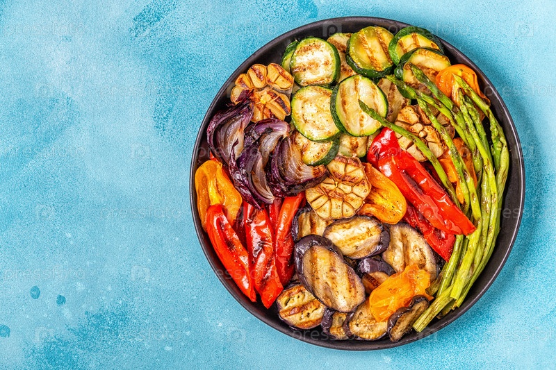 Жареные овощи на тарелке с соусом
