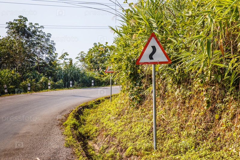 Знак извилистой дороги на горной дороге, предупреждающий дорожный знак Лаос