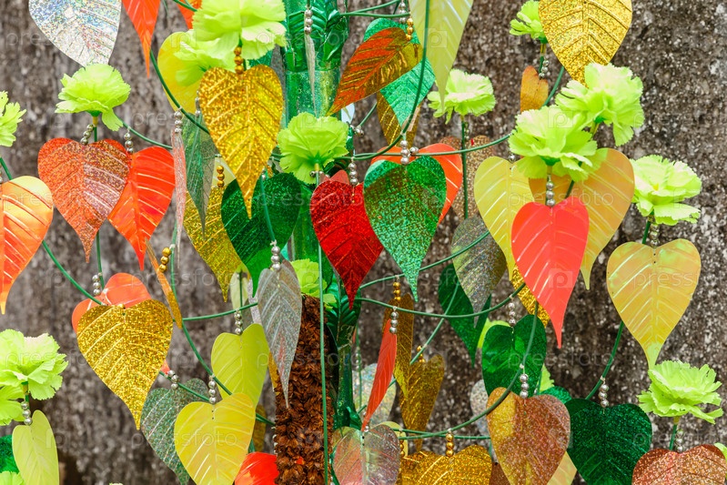 Искусственные красочные листья дерева бодхи на фоне серой стены, текстуры и фона