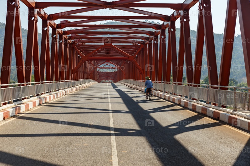 Велосипедист едет по мосту. Мост через реку Меконг. Провинция Сайнябули, Лаос