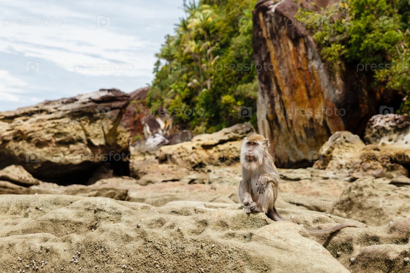 Обезьяна сидит на скалах на острове Борнео Малайзия