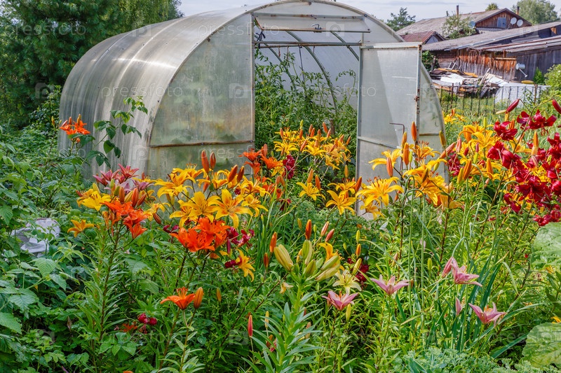 Теплица с томатами, альстромерия свит лаура, желтые цветы в саду
