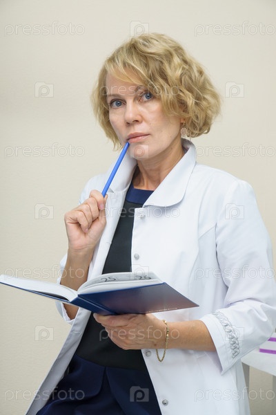 Женщина средних лет в белом халате держит синий ежедневник. Женщина-врач, медицинский работник