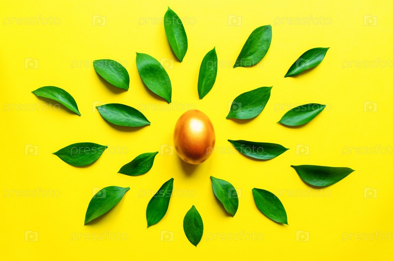 Праздничный пасхальный фон. Золотое, стильное пинтованное яйцо с листьями рускуса на желтом фоне