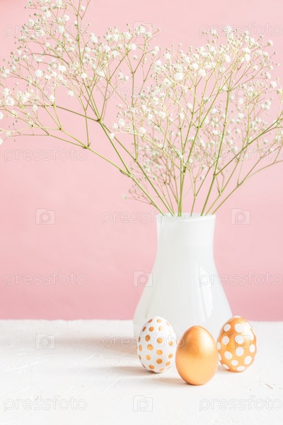 Украшение интерьера с Пасхой. Три золотых яйца и белая цветущая гипсогила на розовом фоне. Нежный уютный натюрморт