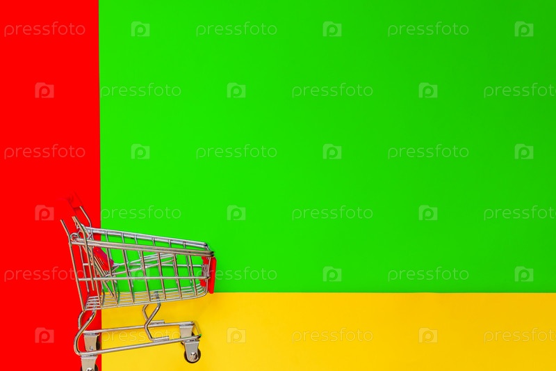 Вид сверху на пустую тележку для покупок на красочном ярком фоне. Концепция покупок и потребительства. Минимальная плоская планировка. копировать пространство