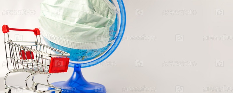 Вспышка коронавируса. Мировая пандемия. Глобус в медицинской маске и тележка для покупок на белом фоне. Концепция онлайн-покупок во время covid-19