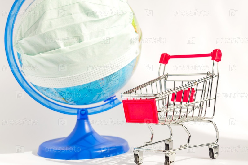Вспышка коронавируса. Мировая пандемия. Глобус в медицинской маске и тележка для покупок на белом фоне. Концепция онлайн-покупок во время covid-19