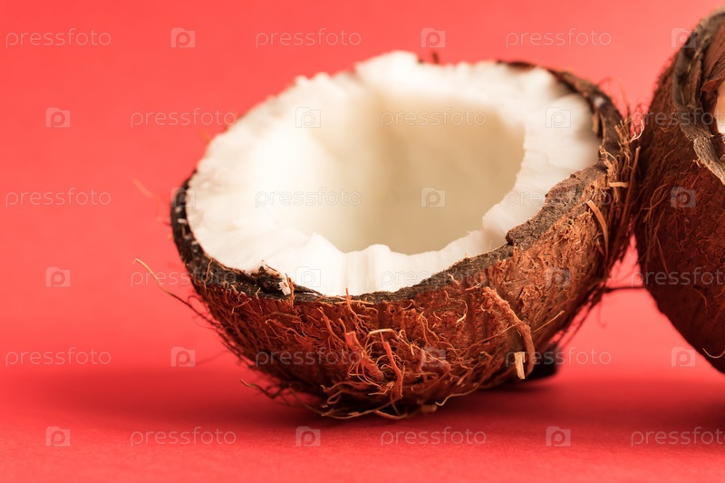 Половина свежего сырого кокоса на красном фоне